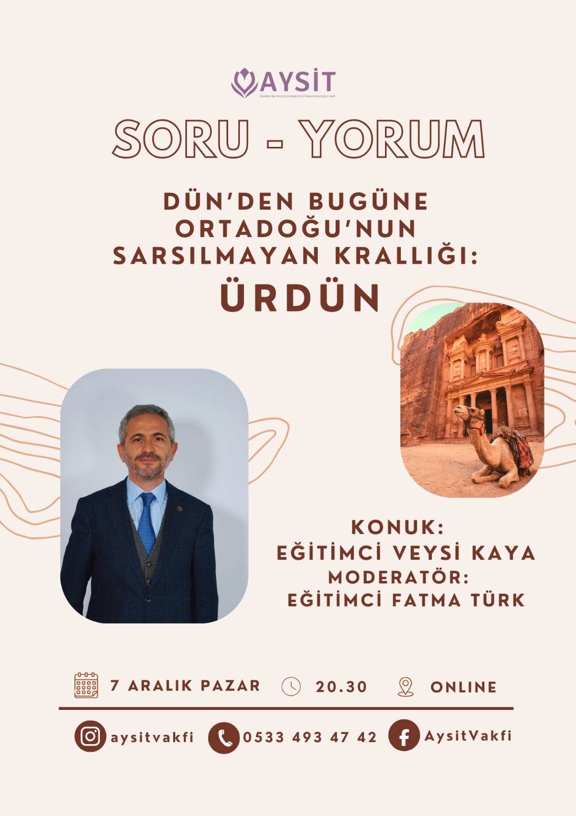 AYSİT Vakfı Soru-Yorum programında bu ay, medeniyetlerin kesişim noktası Ürdün’ü konuşuyoruz.✨